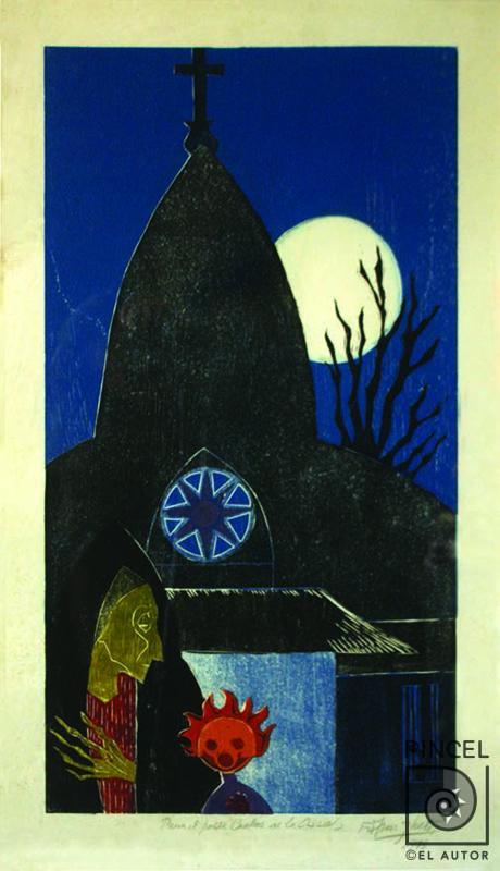 Autor Amighetti, Francisco Título Nocturno con iglesia Técnica GrabadoXilografía Año 1978 Medidas 69 x 37 taco Temática Composición con figura Otros Datos Para el poeta Carlos de la Ossa Obra sin numerar. Palabras Clave Nocturno - Iglesia - Luna - Mujer - Niño - Vitral - árbol