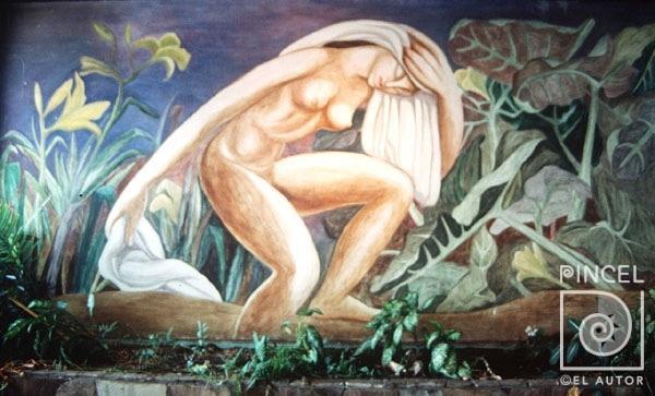 Autor Bertheau, Margarita Título Nacimiento de Venus o Emergiendo de las aguas Técnica Mural Al fresco Año 1956 Medidas 312 x 615 cm Temática Alegoría Desnudo Palabras Clave Mujer - Desnudo - Emerger - Manto - Alegoría - Nacimiento - Venus - Selva - Tallos - Flores