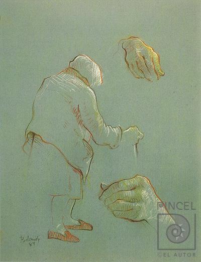 Autor Bolandi, Dinorah Título Marina Técnica DibujoLápiz de color sobre papel Año 1984 Medidas 32 x 24cm Temática Retrato Palabras Clave Marina - Mujer - Mayor - Adulto - Senilidad - Manos - Bastón - Canas - Espalda - Madre de - Artista - Dinorah Bolandi