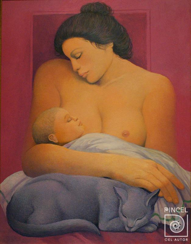 Autor Carballo, Fernando Título Madre II Técnica PinturaÓleo sobre tela Año 2015 Medidas 76 x 60 cm Temática Desnudo Palabras Clave Madre II - Maternidad - Mujer - Bebe - Niño - Infante - Gato - Desnudo - Senos - Cuido - Amor - Protección - Ternura - Amor