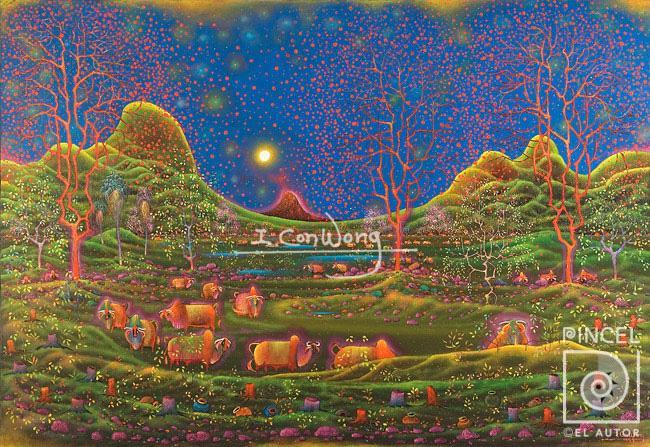 Autor Con Wong, Isidro Título Dando vuelta para volver Técnica PinturaAcrílico Año 1997 Medidas 80 x 120 cm Temática Paisaje Palabras Clave Dando vuelta para volver - Montañas - Sol - árbol - Vacas - Toros - Volcán - Hojas - Flores