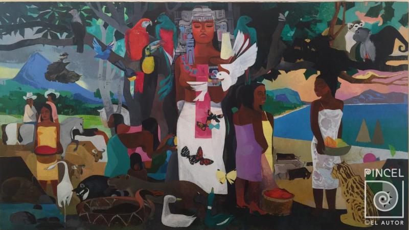 Autor Daell, Luis Título Costa Rica Técnica PinturaAcrílico Año 1996 circa Medidas 113 x 200 cm Temática Alegoría Palabras Clave Mujer - Costa Rica - Flora - Fauna - Diversidad - Paisaje - Montañas - árbol - Alegoría - Campesinos - Indígena - Mar - Aves - Lapas - Volcán - Monos - Serpiente - Jaguar - Mariposas