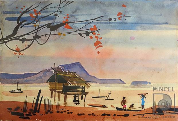 Autor Daell, Luis Título Sin título Técnica PinturaAcuarela sobre papel Año Sfch Medidas 23 x 30.5 cm Temática Paisaje Marino Palabras Clave Paisaje - Casas - Limón - Caribe - Pilotes - Playa - Lanchas - Mar - Tropical - Mujer - Cargar - Escalera - Orilla - Arena - Montaña - Cielo - Rama - árbol - Atardecer