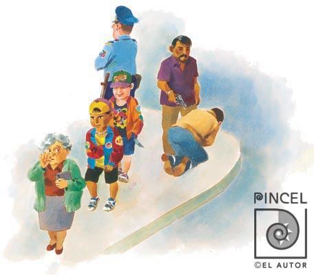 Autor Díaz, Hugo Título Seguridad Técnica PinturaAcuarela Año Sfch Medidas Temática Composición con figura Otros Datos Ilustraciones de Soy Coplero, año de edición 1999. Palabras Clave Hombres - Calle - Acera - Policía - Inútil - Indiferencia - Robo - Asalto - Inseguridad - Arma - Maltrato - Maleantes - Anciana - Miedo - Temor