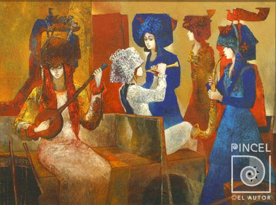 Autor Fernández, Rafael (Rafa) Título Concierto Técnica PinturaÓleo sobre lino Año 1989 Medidas 61 x 80 cm Temática Composición con figura Palabras Clave Mujeres - Velos - Sombrero - Animal - Pájaros - Elegancia - Instrumentos - Música - Laud - Trompeta - Flauta - Concierto - Habilidad