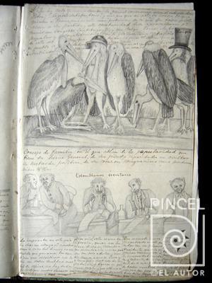 Autor Figueroa, José María Título J.R.R IVI 715. Página 93 Técnica DibujoLápiz De grafito Año 1876 -1885 circa Medidas 35.3 x 22.8 cm Temática Histórico Caricatura Palabras Clave Caricatura - Pájaros - Reunidos - Animales - Rata - Ratón - Gato - Papeles - Escribir - Texto