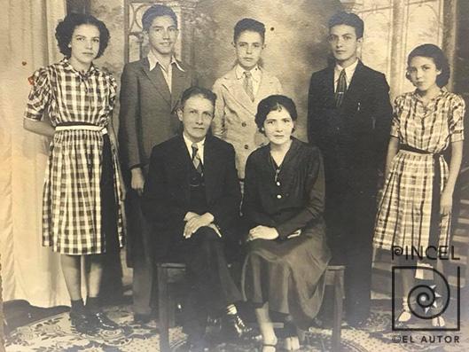 En la fotografía aparecen Julio Fonseca Gutiérrez (compositor nacional), María Mora, y sus hijos Iris, Harold (artista), Julio (sacerdote), Jaime y Mercedes