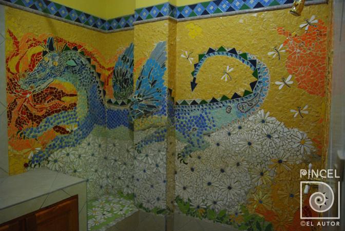 Autor Fournier, Cristina Título Dragón y ave fenix Técnica Mural Mosaico Año 2007 circa Medidas 6.48 m2 Temática Composición floral Decorativo Otros Datos Este mural lo diseñó la artista para uno de los baños de una casa de su propiedad. Palabras Clave Mural - Baño - Dragón - Ave Fenix - Luciérnagas - Libélula - Fuego - Flores
