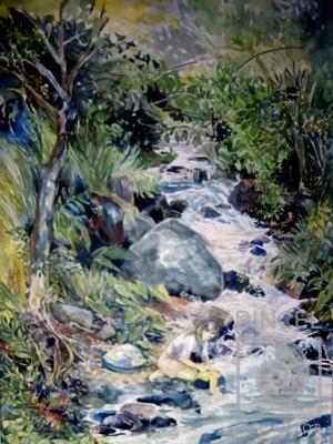 Autor Fournier, Cristina Título Mujer lavando Técnica PinturaAcuarela Año 1978 Medidas 73.5 x 55 cm Temática Paisaje Palabras Clave Paisaje - Bosque - árboles - Vegetación - Río - Agua - Corriente - Piedras - Mujer - Acción - Lavar - Ropa - Trabajo