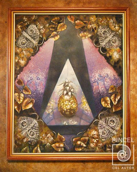 Autor Gordienko, Xenia Título Sin título Técnica PinturaÓleo sobre tela Año 1993 Medidas 77 x 62 cm Temática Bodegón Alegoría Palabras Clave Piña - Joyas - Mariposas - Hojas