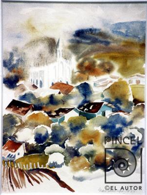Autor Herrera Amighetti, Grace Título Iglesia Técnica PinturaAcuarela Año 1977 Temática Paisaje Palabras Clave Paisaje - Cielo - Montañas - Pueblos - Casas - Caserío - Religión - Iglesia - Fe