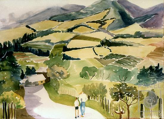 Autor Herrera Amighetti, Grace Título San Luis de Heredia Técnica PinturaAcuarela Año 1986 Temática Paisaje Otros Datos Exposición Instituto de Cultura Hispánica. Palabras Clave Paisaje - Lugar - San Luis - Heredia - Montañas - Pueblo - Casas - Campesinos - Personas - Hombre - Niño - Sombrero - Machete - Camino
