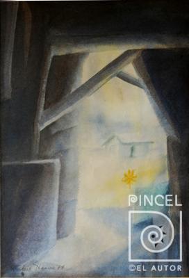 Autor Herrera, Fabio Grupo Bocaracá Título Paisaje Técnica PinturaAcuarela Año 1974 Medidas 45.5 x 32.5 cm Temática Paisaje Palabras Clave Paisaje - Entrada - Madera - Casa - Fondo