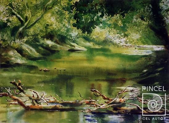 Autor Hine, Ana Griselda Título Aguas Verdes Técnica PinturaAcuarela Año 1999 Medidas 52 x 74 cm Temática Paisaje Otros Datos Palabras Clave Paisaje - Vegetación - árboles - Plantas - Lago - Agua - Troncos - Frescura - Verano