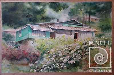 Autor Hine, Ana Griselda Título De lata y Hortensias 1 Técnica PinturaAcuarela Año 2009 Medidas 55 x 77 cm Temática Paisaje Palabras Clave Casa - árboles - Humo - Antena - Ventana - Puerta - Flores - Arbustos - Hortensias - Paisaje de altura - Frío