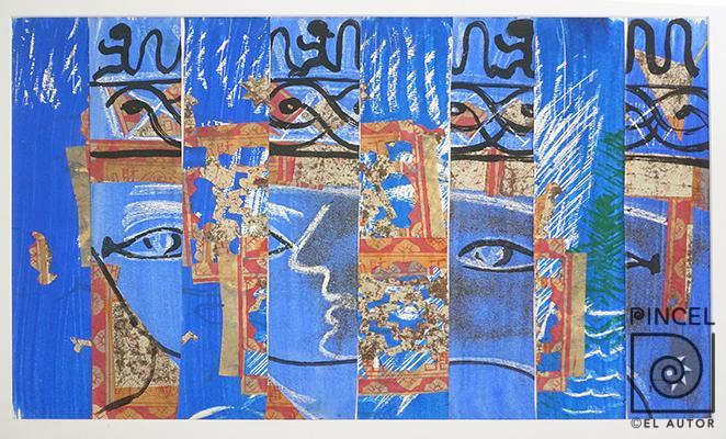 Autor Lizano, Roberto Grupo Bocaracá Título Sin título Técnica PinturaMixta Collage y pintura acrílica Año 2001 Medidas 29 x 44 cm Temática Composición con figura Otros Datos Expuesta en la Galería Rafa Fernandez en la Casa del Artista Exposición titulada Rostros 2015. Palabras Clave Collage - Rostro - Egipcio - Maquillaje - Ojos - Corona