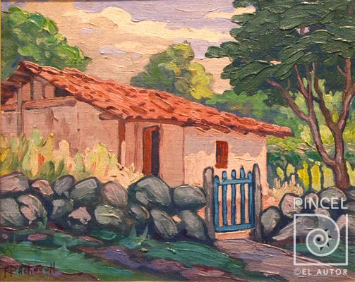 Autor Pacheco, Fausto Título Casa de adobe con tapia de piedra Técnica PinturaÓleo sobre tela Año Sfch Medidas 17 x 21 cm Temática Paisaje Otros Datos Expuesta en el Museo Calderón Guardia en setiembre 2014. Palabras Clave Paisaje - árboles - Vegetación - Campo - Casa - Campesina - Adobe - Tejas - Portón - Entrada - Tapia - Muro - Piedras