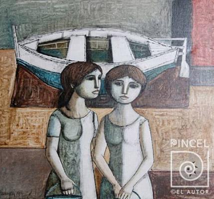 Autor Ranucci, Lucio Título Dos jovenes Técnica PinturaÓleo sobre canvas Año 1972 Medidas 71.1 x 76.2 cm Temática Composición con figura Palabras Clave Mujeres - Jóvenes - Seriedad - Espera - Pensativa - Cargar - Baldes - Bote - Barco - Embarcación