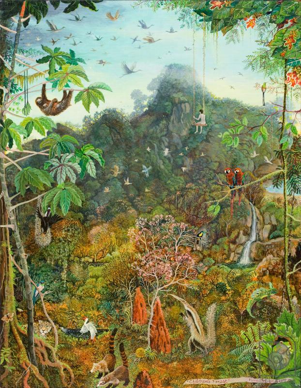 Autor Sáenz de Langlois, Flora Título Childrens Forest Técnica PinturaAcrílico Año 2007 Medidas 45.72 x 35.56 cm Temática Alegoría Palabras Clave Bosque de niños - Lapas - Madre oso perezoso - Rama - Montaña - Hamaca - Mecer - árboles - Bebe - Mapaches - Catarata - Aves - Rana - Mariposa