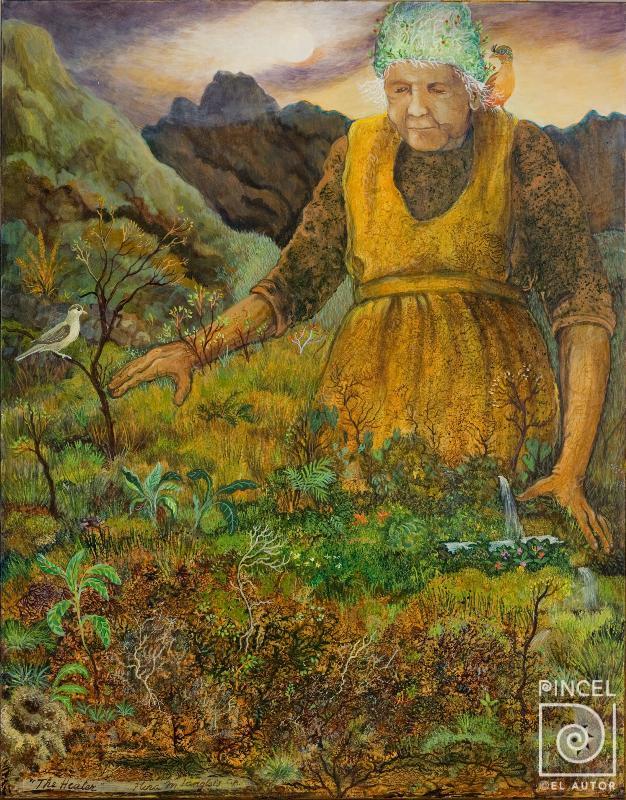 Autor Sáenz de Langlois, Flora Título The healer Técnica PinturaAcrílico Año 2008 Temática Alegoría Palabras Clave La curadora - Madre naturaleza - Pájaros - Bosque - Cascada - Montañas - Vegetación