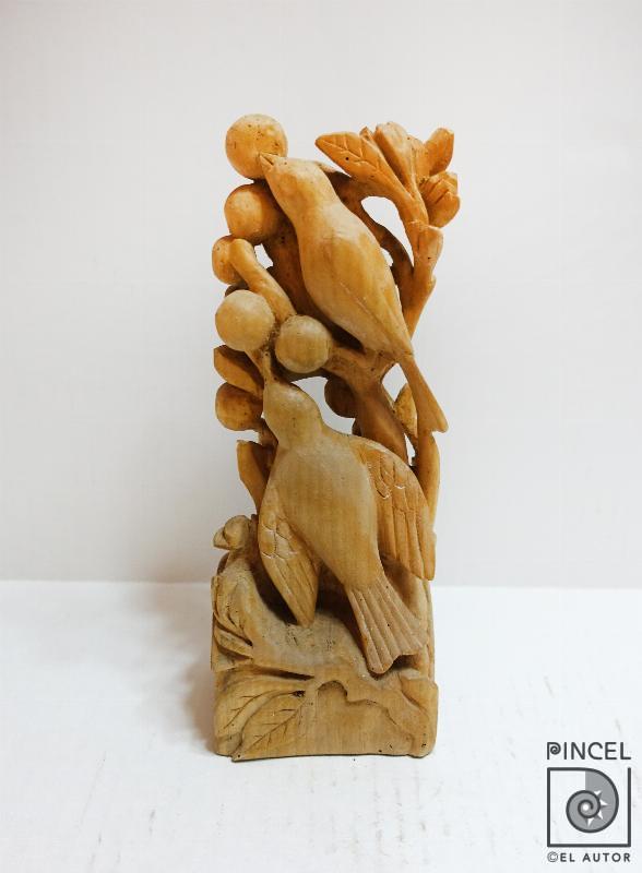 Autor Sáenz de Langlois, Flora Título Sin título Técnica EsculturaTalla directa en madera Año 1996 Temática Animalística Palabras Clave Aves - Pájaros - Planta - Hojas - Ramas - Frutas - Alimento - Comer - Picar