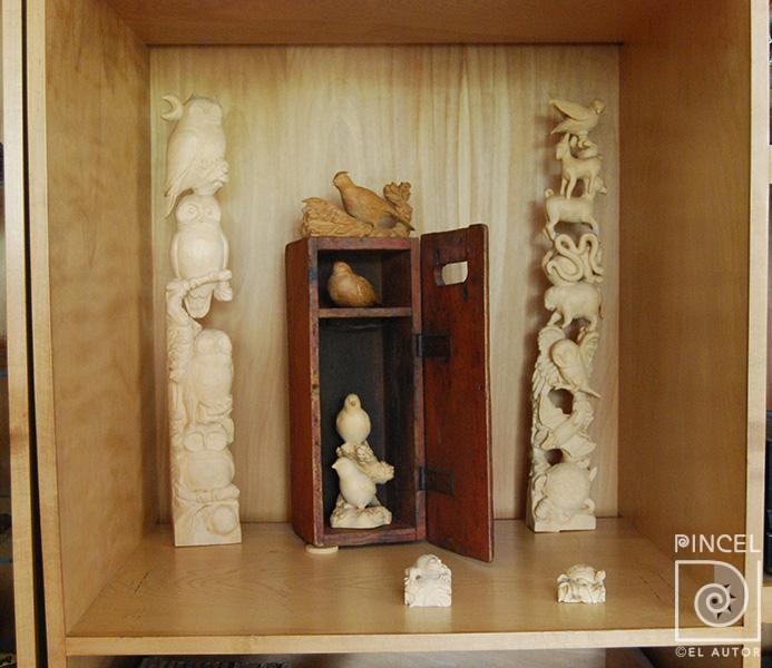Autor Sáenz de Langlois, Flora Título Totems y animales tallados por la artista, en su estudio Técnica EsculturaTalla En madera Año 2016 Medidas Pequeño formato Temática Animalística Palabras Clave Estudio - Artista - Decoración animales - Tótem - Madera - Flora Sáenz de Langlois