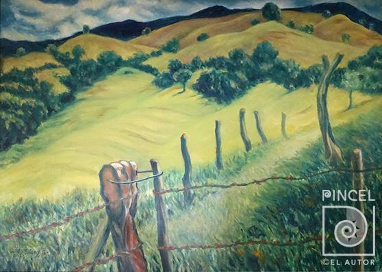 Autor Sáenz, Guido Título Sin título Técnica PinturaAcrílico sobre tela Año 2013 Medidas 72 x 112 cm Temática Paisaje Palabras Clave Paisaje - Vegetación - Plantas - árboles - Montañas - Cerca - Alambre - Portón - Camino