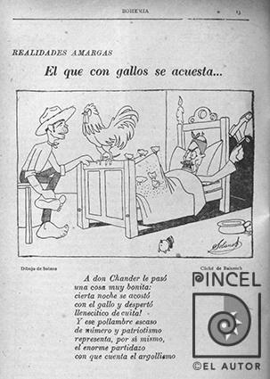 Autor Solano, Noé Título El que con gallos se acuesta... Técnica GrabadoImpreso Año 1923 Temática Ilustración Otros Datos Semanario Bohemia 7 oct 1923 pag15