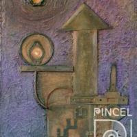 Zulay Soto frente a su obra La contaminación de las playas, tríptico
