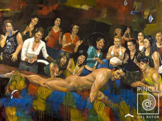 Autor Stanley, Rodolfo Título Despedida de soltera 3 Técnica PinturaAcrílico sobre tela Año 2007 Medidas 110 x 148 cm Temática Composición con figura Palabras Clave Despedida - Celebración - Fiesta - Mujeres - Femenino - Sexo - Baile - Bar - Licor - Strep tease - Striper - Hombre - Desnudo - Música - Sonido