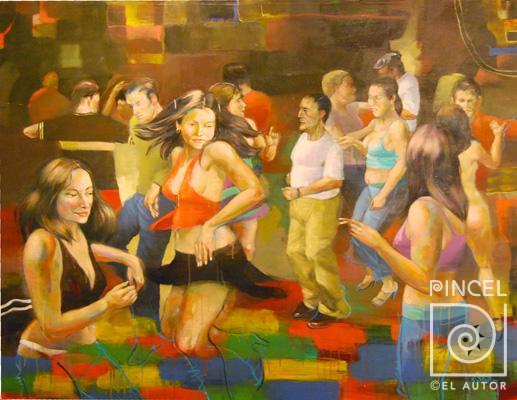Autor Stanley, Rodolfo Título Perdido en el bailongo Técnica PinturaAcrílico sobre tela Año 2006 circa Medidas 120 x 150 cm Temática Composición con figura Otros Datos Esta obra estuvo en la exposición Valoarte de Setiembre 2007 Palabras Clave Bailongo - Baile - Fiesta - Música - Movimientos - Sensualidad - Alegría - Hombres - Mujeres - Parejas - Danza