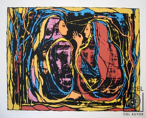 Autor Valverde, César Título Las tejedoras de los sueños Técnica GrabadoSerigrafía sobre papel Año 1996 Medidas 41 x 56 cm Taco Temática Composición con figura Palabras Clave Mujeres - Sentadas - Mantos - Perfil - Manos - Hablar - Amigas - Amistad - Compañía - Preocupación - Cuclillas