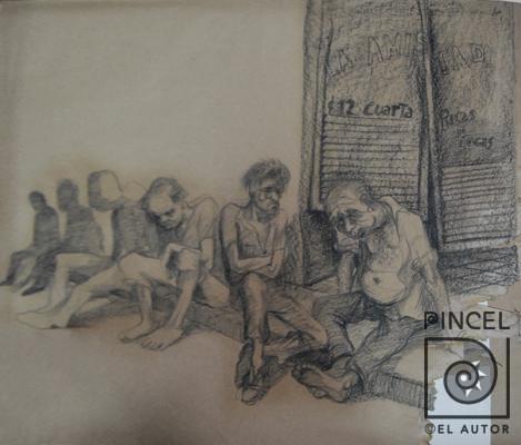 Autor Zeledón Guzmán, Néstor Título La amistad Técnica DibujoCarboncillo Año Sfch Medidas 97 x 116 cm Temática Composición con figura Palabras Clave Dibujo - Hombres - Amigos - Amistad - Borrachos - Calle - Acera - Bar - Cantina - Fila - Descanso - Alcoholismo - Licor - Destruccion - Vicio - Umbral - Cuarta de guaro - Bocas