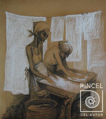 Autor Zeledón Guzmán, Néstor Título Las lavanderas Técnica DibujoMixta Carboncillo y pastel Año 1979 Medidas 97 x 100 cm Temática Composición con figura Costumbrista Palabras Clave Dibujo - Mujeres - Anciana - Vejez - Arrugas - Canas - Lavanderas - Lavar - Ropa - Trabajo - Esfuerzo - Pila - Agua - Jabón - Alambres - Colgar - Pañuelo - Delantal - Pensativa - Tristeza