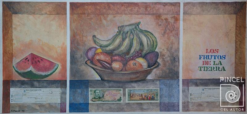 Autor Bernal Ponce, Juan Título Los frutos de la tierra Técnica PinturaMixta Acrílico. Collage Año 1996 Medidas 56.5 x 117.5 cm Temática Bodegón Otros Datos Tomado de la página de internet juanbernalponce.com Palabras Clave Los frutos de la tierra - Bodegón - Sandía - Frutas - Banano - Uva - Naranja - Manzana - Billete - Cheque - Banco Anglo