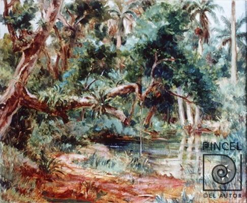 Autor Bierig, Alex Título Campos de Cuba Técnica PinturaÓleo Año 1925 Medidas 53 x 64 cm Temática Paisaje Otros Datos Fotografía de María E. Guardia 1991 © Palabras Clave Paisaje - Lugar - Cuba - Caribe - Bosque - Troncos - árboles - Vegetación - Agua - Reflejo