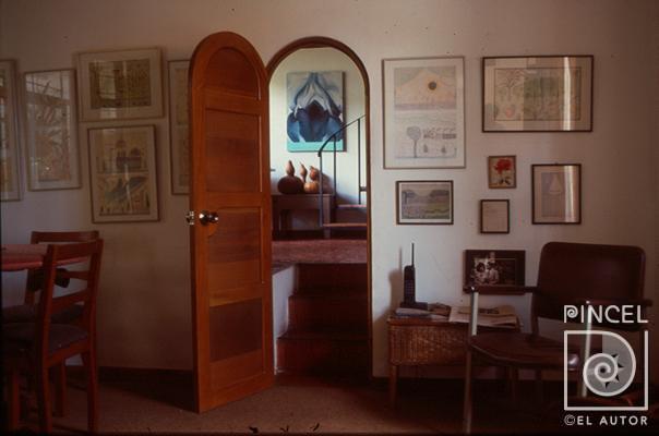 Foto de la sala de la casa, con puerta ovalada; las pinturas de Doña Marina a los lados, y obra de una artista americana en el Fondo.