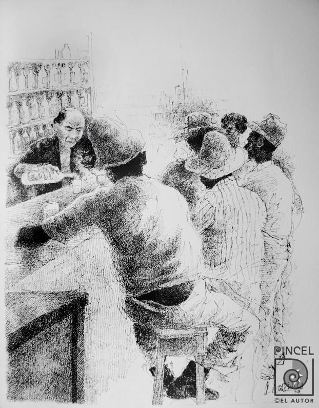 Autor Castaneda, Carlos (extranjero) Título Sin título Técnica GrabadoLitografía de dibujo con plumilla Año 1979 Medidas 35.5 x 28 cm Temática Composición con figura Interior Palabras Clave Lugar - Bar - Cantina - Hombres - Tomar - Licor - Botellas - Vasos - Servir - Sombreros - Borrachos - Barra - Vicios