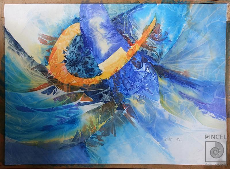 Autor Delcore, Ena Título Abstracto Técnica PinturaAcuarela Año 1998 Medidas 71 x 100 cm Temática Abstracto Palabras Clave Abstracto - Colores - Azules - Naranja - Fuerza - Movimiento