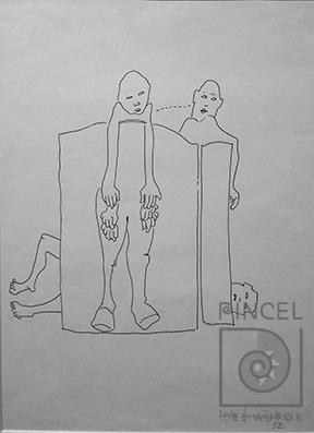 Autor Fernández, Lola Título Sin título Técnica DibujoTinta sobre papel Año 1982 Temática Composición con figura Palabras Clave Personajes - Biombo - Ver - Manos - Patas - Pies - Descalzo - Acostado - Piso