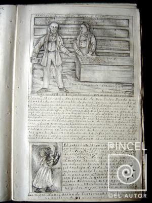 Autor Figueroa, José María Título J.R.R IVI 715. Página 43 Técnica DibujoLápiz De grafito Año 1876 -1885 circa Medidas 35.3 x 22.8 cm Temática Histórico Caricatura Otros Datos El dibujo dice: " Almacen de efectos de Pedro P Pardo. Moin." El segundo dibujo dice: "La negra Nanez haciendo lastimosas esclamaciones" Palabras Clave Dibujo - Hombres - Mujer - Negra - Pedir - Dinero - Reclamar - Texto
