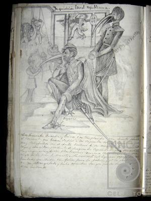 Autor Figueroa, José María Título J.R.R IVI 715. Página 92 Técnica DibujoLápiz De grafito Año 1876 -1885 circa Medidas 35.3 x 22.8 cm Temática Histórico Caricatura Otros Datos El dibujo dice: "Inquicicion liberal republicana" Palabras Clave Caricatura - Pájaros - Soldados - Hombres - Ahorcar - Texto