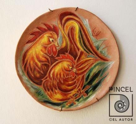 Autor Fonseca Boraschi, Cecilia Título Gallos Técnica Cerámica Pintada al óleo e incisión Año 2001 Medidas 32 cm (diámetro) Temática Animalística Palabras Clave Animal - Gallos - Plumas