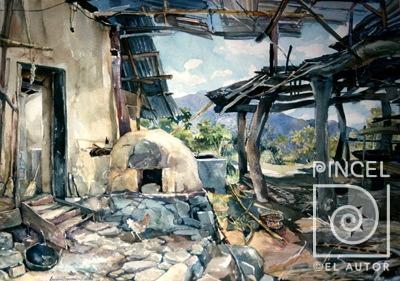 Autor Fournier, Cristina Título Trapiche 2 Técnica PinturaAcuarela Año 1978 Medidas 51 x 71 cm Temática Costumbrista Palabras Clave Paisaje - Cielo - Nubes - Montaña - Casa - Latas - Madera - Trapiche - Piedras - Tugurio - Pobreza - Desorden - Animal - Gallina - Horno - Abandono - Desuso