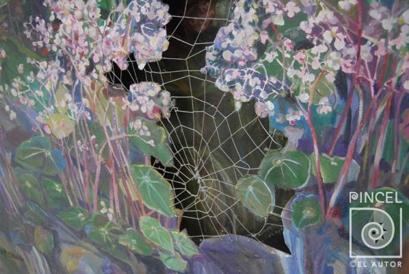 El cuadro está horadado en la parte inferior donde la artista tejió una telaraña y pintó en la parte posterior al viejo de monte