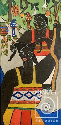 Autor Garita, Disifredo Título Sin título Técnica PinturaÓleo Año 1968 Medidas 133 x 62.5 cm Temática Composición con figura Palabras Clave Mujer - Peinar - Jalar - Cabello - Niña - Vestido - Ave - Pájaro - Vasija - Flores - Ramas - Hoja - Retoño - Ngobe - Indígena - Negra - Raza - Orilla - Río - Flor - Reina de la noche - Granada - Fruta - Vestuario