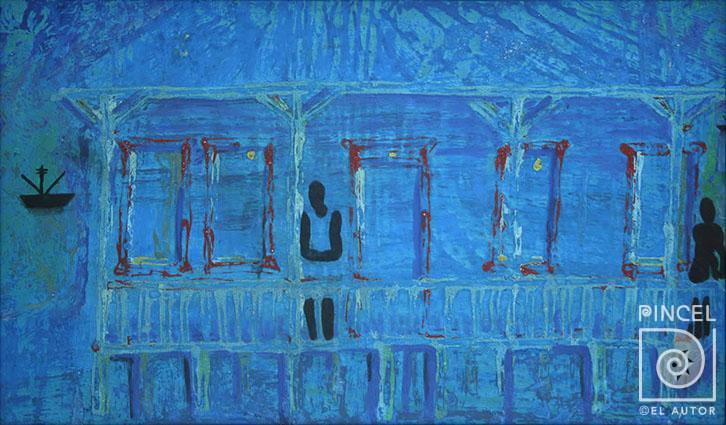 Autor González, Leonel Grupo Bocaracá Título Estudio de agua Técnica PinturaMixta Pintura industrial y esgrafiado Año 2010 Medidas 47 x 81 cm Temática Composición con figura Paisaje Marino Otros Datos Tomada de la página de internet www.galeria11-12.com Palabras Clave Estudio de agua - Casa - Pilotes - Personaje - Baranda - Ventana - Puerta - Anochecer