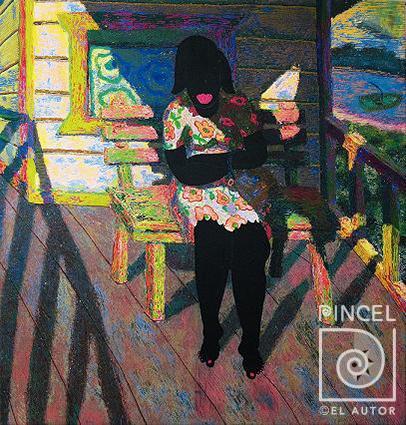 Autor González, Leonel Grupo Bocaracá Título Sin título Técnica PinturaMixta Pintura industrial y esgrafiado Año Sfch Temática Composición con figura Interior Otros Datos Tomada de la página del Facebook del artista Palabras Clave Mujer - Banca - Descalza - Banca - Silla - Sombra - Sol - Luz - Mar - Bote - Baranda - Labios - Rosados - Ventana - Casa - Morena - Negra - Afrocaribeña