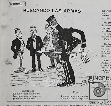 Autor Hernández, Francisco Título Buscando las armas Técnica GrabadoOtros Año 1913 Temática Ilustración Caricatura Otros Datos La Linterna 14 Nov 1913 Tomado de internet www.sinabi.go.cr Palabras Clave Crítica - Burla - Chota - Política