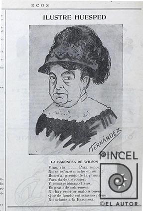 Autor Hernández, Francisco Título Ilustre huesped, la baronesa de Wilson Técnica GrabadoOtros Año 1913 Temática Ilustración Caricatura Otros Datos Ecos 7 Jun 1913 Tomado de internet www.sinabi.go.cr Palabras Clave Crítica - Burla - Chota - Política